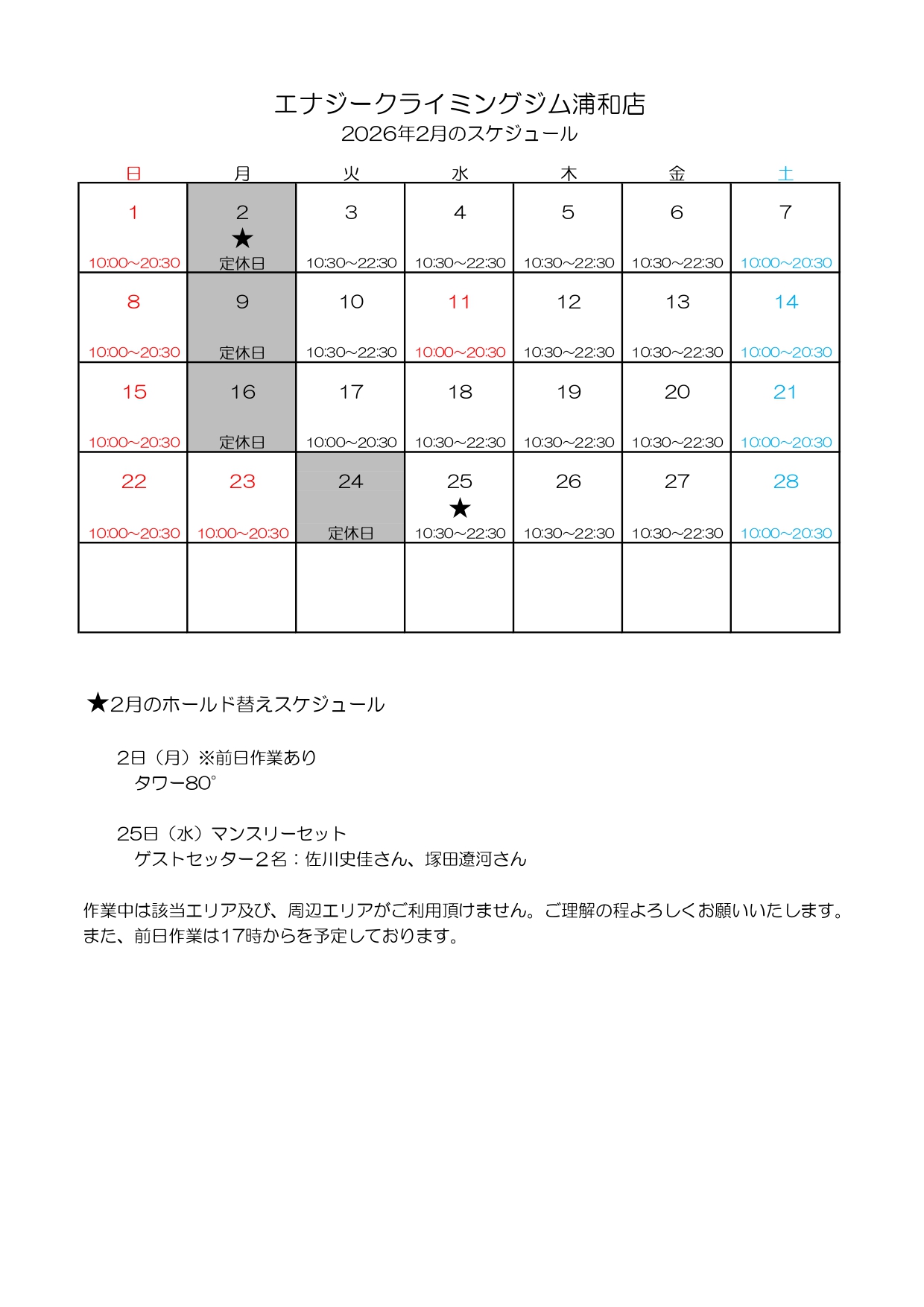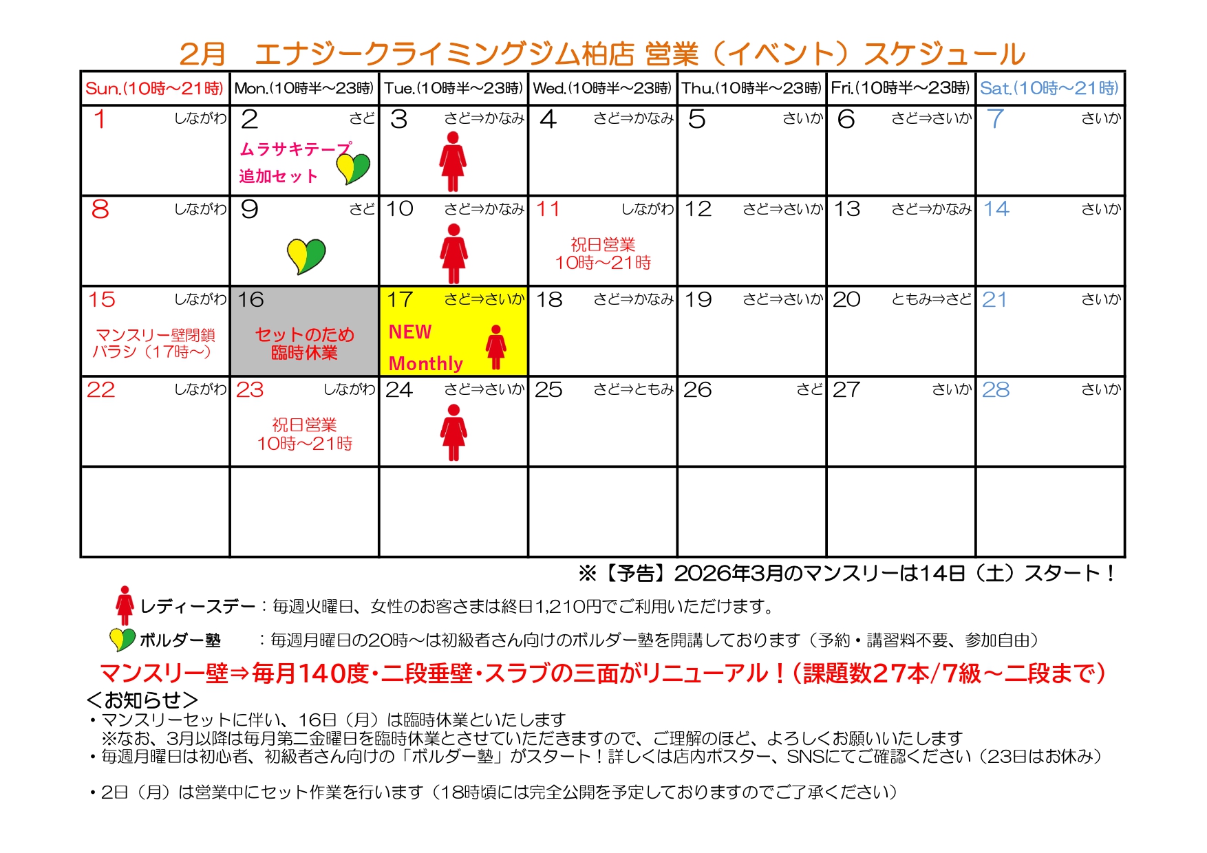 お知らせNEWS 2026.02.03柏店柏店<回数券SALE>のお知らせ 2026.01.27柏店エナジークライミングジム柏店「大改革」 2025.12.27柏店年末年始の営業時間についてお知らせです 2025.12.27浦和店年末年始の営業時間のお知らせ 2025.12.24柏店柏店イベント「マンスリーBINGO」開催中! 2025.11.19柏店イベント「愛とクライミングだけが友達さ♪」終了のお知らせ 2025.10.02柏店<柏店>イベント「秋のパン祭り」開催のお知らせ 2025.09.10柏店イベント「愛とクライミングだけが友達さ♪」開催のお知らせ 2025.07.04柏店キッズボルダリング<サマースクール>のお知らせ※お申込みは終了しました 2025.05.21エナジーより一部料金改定のお知らせ 2025.05.20柏店<柏店>ポップアップイベント「gekko japonicus」展示販売会のお知らせ 2025.04.09柏店<柏店>イベント「春のパン祭り」開催のお知らせ 2025.01.14浦和店「年パス10%OFF」キャンペーンのお知らせ 2024.12.04柏店年末年始の営業についてお知らせ 2024.12.04浦和店年末年始の営業についてお知らせ 2024.10.01柏店コンペ「プリンセス35」競技規則 2024.10.01柏店コンペ「プリンセス35」タイムスケジュールのお知らせ 2024.09.12柏店コンペ「プリンセス35」参加者リスト(10/4) 2024.09.03柏店コンペ「プリンセス35」申し込み受付中 2024.08.21エナジーより一部料金改定のお知らせ 2024.08.08柏店コンペ「プリンセス35」開催のお知らせ 2024.04.03柏店イベント「STAFF GENERATIONS」お知らせ 2024.01.19柏店イベント「マンスリーBINGO」1月も継続開催中! 2023.12.23浦和店浦和店 定休日変更のお知らせ 2023.12.20柏店イベント「マンスリーBINGO」開催中! 2023.10.17柏店コンペ「THE CHALLENGE 2023」レポート 2023.10.15柏店コンペ「THE CHALLENGE 2023」最終リザルト 2023.10.15柏店コンペ「THE CHALLENGE 2023」オープンマスタークラス予選リザルト 2023.10.15柏店コンペ「THE CHALLENGE 2023」スーパーミドルクラス予選リザルト 2023.10.15柏店コンペ「THE CHALLENGE 2023」ミドルクラス予選リザルト 2023.10.15柏店コンペ「THE CHALLENGE 2023」ファンクラス予選リザルト 2023.10.14柏店柏店コンペ「THE CHALLENGE 2023」最終エントリーリスト 2023.10.11柏店コンペ「THE CHALLENGE 2023」開催に伴うお知らせ※重要※ 2023.10.05柏店柏店コンペ「THE CHALLENGE 2023」開催要項・競技規則のお知らせ 2023.10.05柏店柏店コンペ「THE CHALLENGE 2023」タイムスケジュールのお知らせ 2023.09.29柏店柏店コンペ「THE CHALLENGE 2023」募集クラスについてお知らせ 2023.09.12柏店柏店コンペ「THE CHALLENGE 2023」申込み開始のお知らせ 2023.09.01柏店コンペ「THE CHALLENGE 2023」開催のお知らせ 2023.08.18浦和店2階ボルダーエリア エルソル ホールド替えしました! 2023.08.12浦和店オートビレイ機が追加されました 2023.08.08浦和店リード85度壁ホールド替え完了 2023.08.06柏店コンペ「プリンセス35」無事終了しました 2023.08.06浦和店エナジーナイトミニセッション1 2023.08.03浦和店ミニイベント開催 2023.08.03柏店コンペ「プリンセス35」エントリーリスト 2023.08.03柏店コンペ「プリンセス35」開催に関するお知らせ 2023.08.01エナジーよりホームページリニューアルのお知らせ 2023.07.30浦和店お盆の営業案内