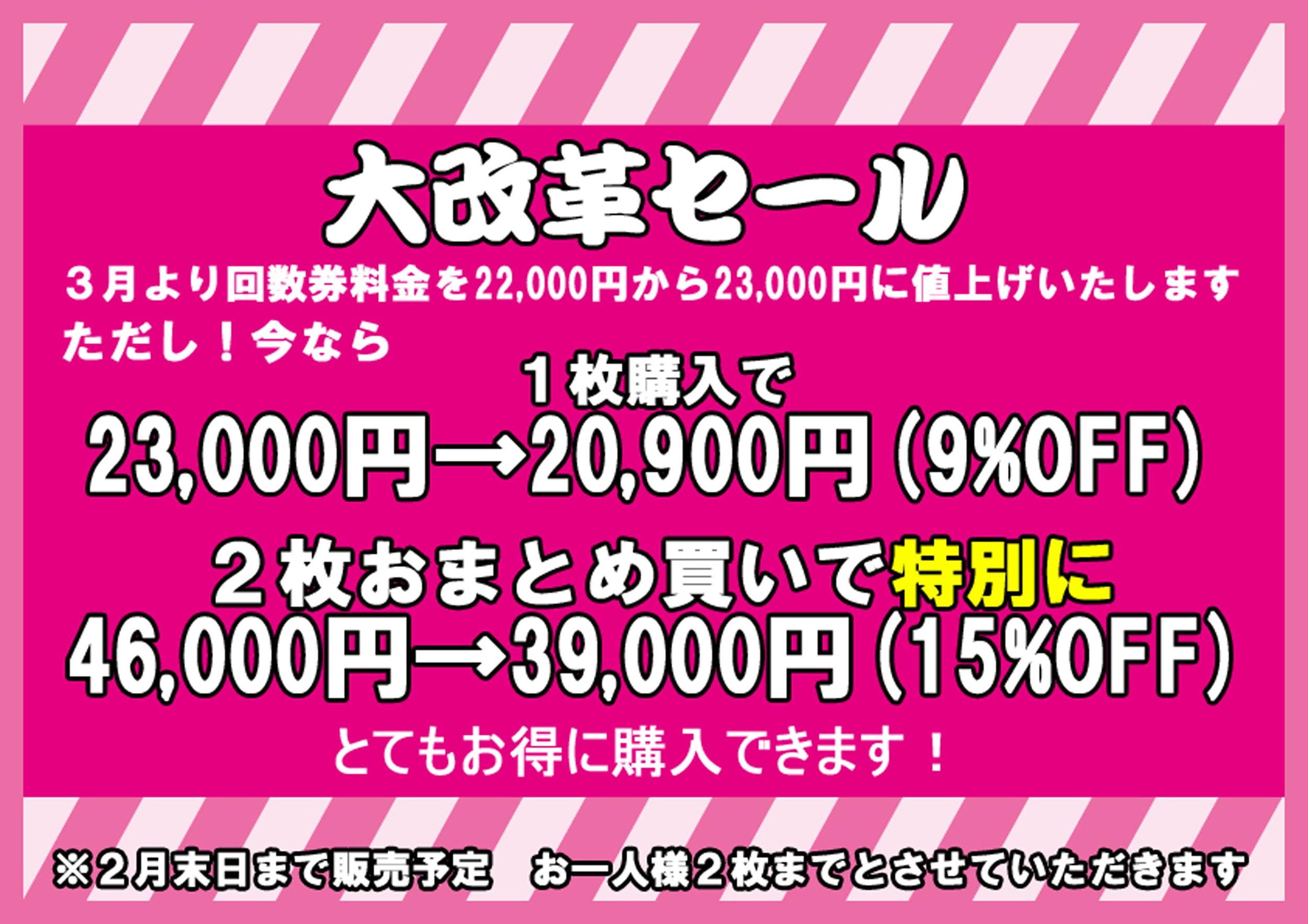 3月より回数券の価格を23,000円に改定させていただくこととなりました。